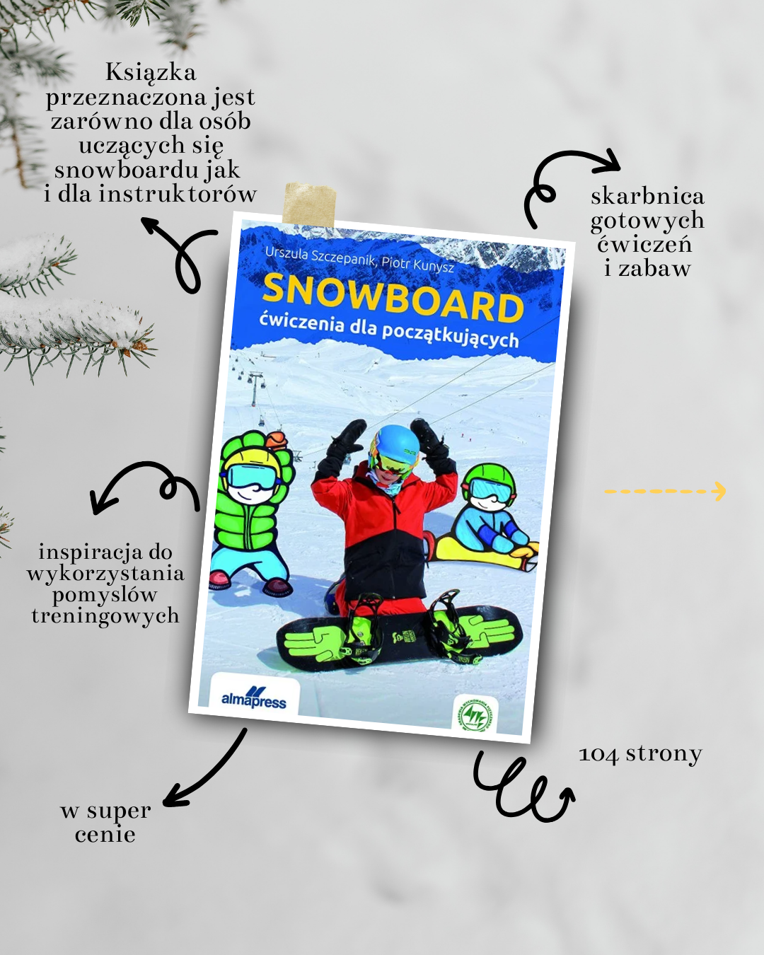 Uzupełnieniem tej pozycji jest książka „Snowboard. Ćwiczenia dla początkujących”, która skupia się na praktycznym aspekcie nauki. To narracja oparta na działaniu, ruchu i doświadczeniu, w której teoria schodzi na dalszy plan, ustępując miejsca konkretnym ćwiczeniom. Autorzy pokazują, że nauka snowboardu nie musi być stresująca ani monotonna. Wręcz przeciwnie, może przypominać zabawę, stopniowo oswajając ciało z deską i śniegiem. Proponowane ćwiczenia pomagają budować pewność siebie, poprawiać koordynację i rozwijać równowagę, co jest kluczowe w pierwszych etapach nauki. Książka doskonale oddaje ducha snowboardu jako sportu dynamicznego, kreatywnego i otwartego na indywidualne tempo rozwoju.
