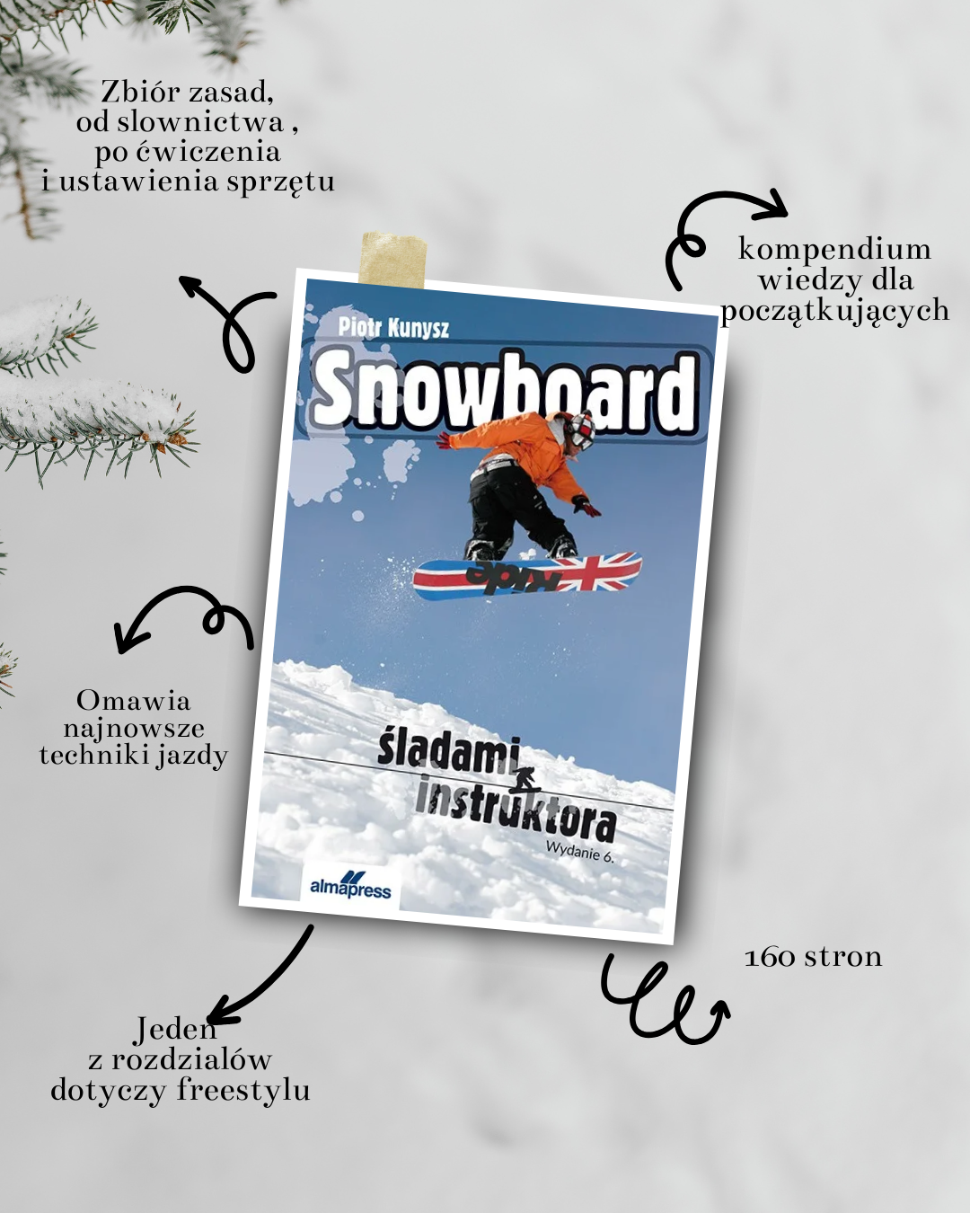 Taką rolę spełnia książka „Snowboard. Śladami instruktora”, która prowadzi czytelnika przez świat snowboardu w sposób przemyślany i uporządkowany. To publikacja, która nie ogranicza się jedynie do suchego opisu techniki, lecz pokazuje snowboard jako spójną całość, od przygotowania sprzętu, przez podstawowe manewry, aż po bardziej zaawansowane elementy jazdy. Autor dzieli się doświadczeniem instruktora, tłumacząc nie tylko jak jechać, ale także dlaczego dane rozwiązania są skuteczne. Dzięki temu czytelnik zaczyna rozumieć logikę ruchu, a nauka przestaje być mechanicznym powtarzaniem poleceń. Książka sprawdza się zarówno jako przewodnik dla początkujących, jak i jako punkt odniesienia dla tych, którzy chcą uporządkować wiedzę i poprawić styl jazdy.