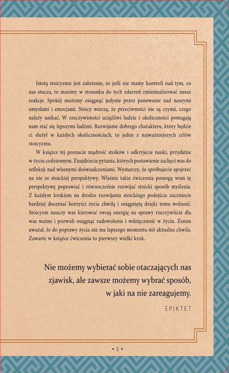 „Nie możemy wybierać zewnętrznych okoliczności, ale decydujemy o naszej na nie reakcji.” Ta ponadczasowa mądrość głoszona przez Epikteta aktualna jest tak samo dzisiaj, jak była wówczas, gdy ją spisał, czyli ponad 2000 lat temu. Dzięki tej książce, z pomocą opisów i rozważań, nauczysz się tego jak można wykorzystać starożytną mądrość w życiu współczesnym.