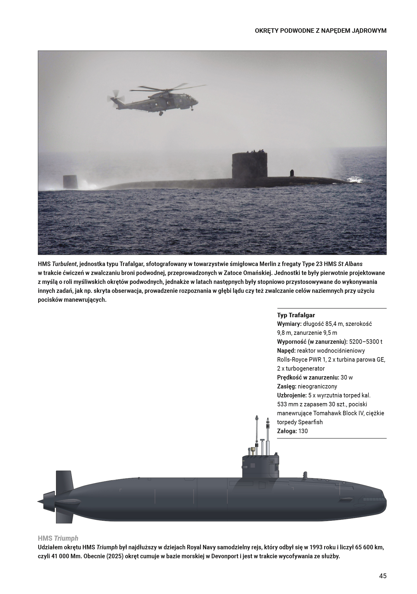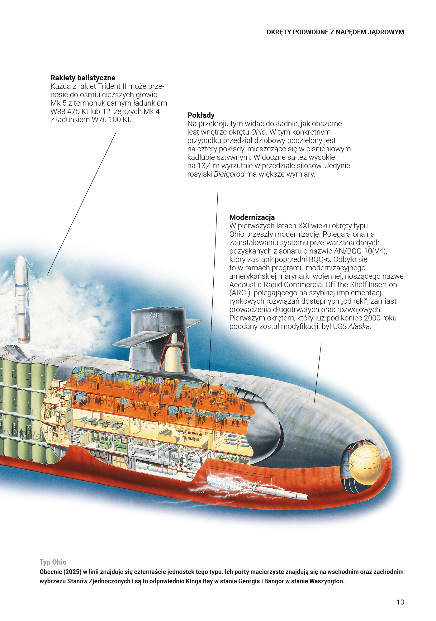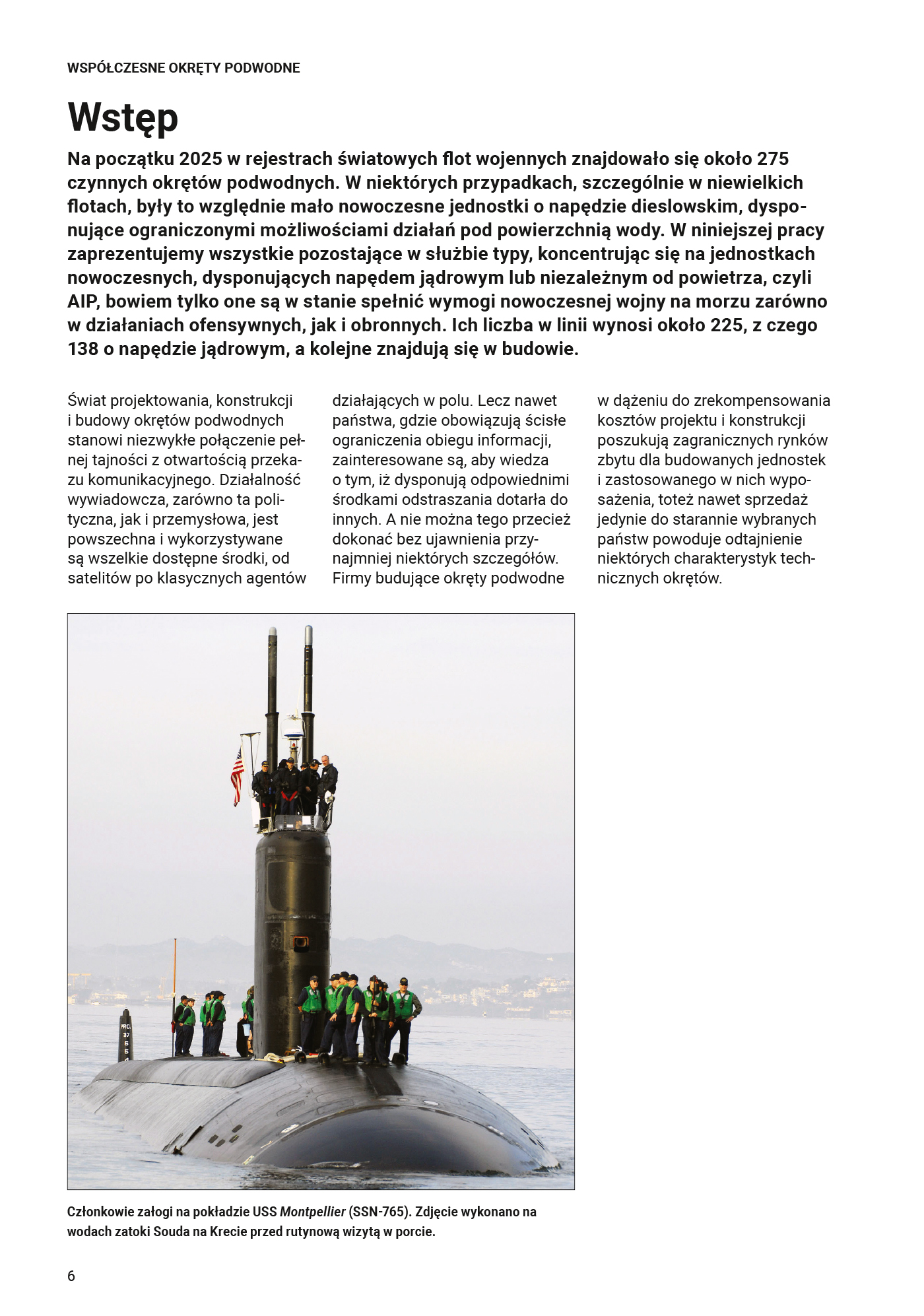 Dowiadujemy się zatem więcej o okrętach podwodnych typu Virginia z napędem jądrowym, podstawowych jednostkach uderzeniowych Marynarki Wojennej USA, wraz z ich właściwościami stealth. Poznamy okręt podwodny typu 039 z napędem spalinowo-elektrycznym chińskiej Marynarki Wojennej, zaprojektowany do działań obronnych na pełnym morzu. Zapoznamy się też z wiekowymi rosyjskimi okrętami typu Delta IV, pochodzącymi z lat 80. XX wieku, które wykorzystują obecnie bezzałogowe pojazdy podwodne (UUV).